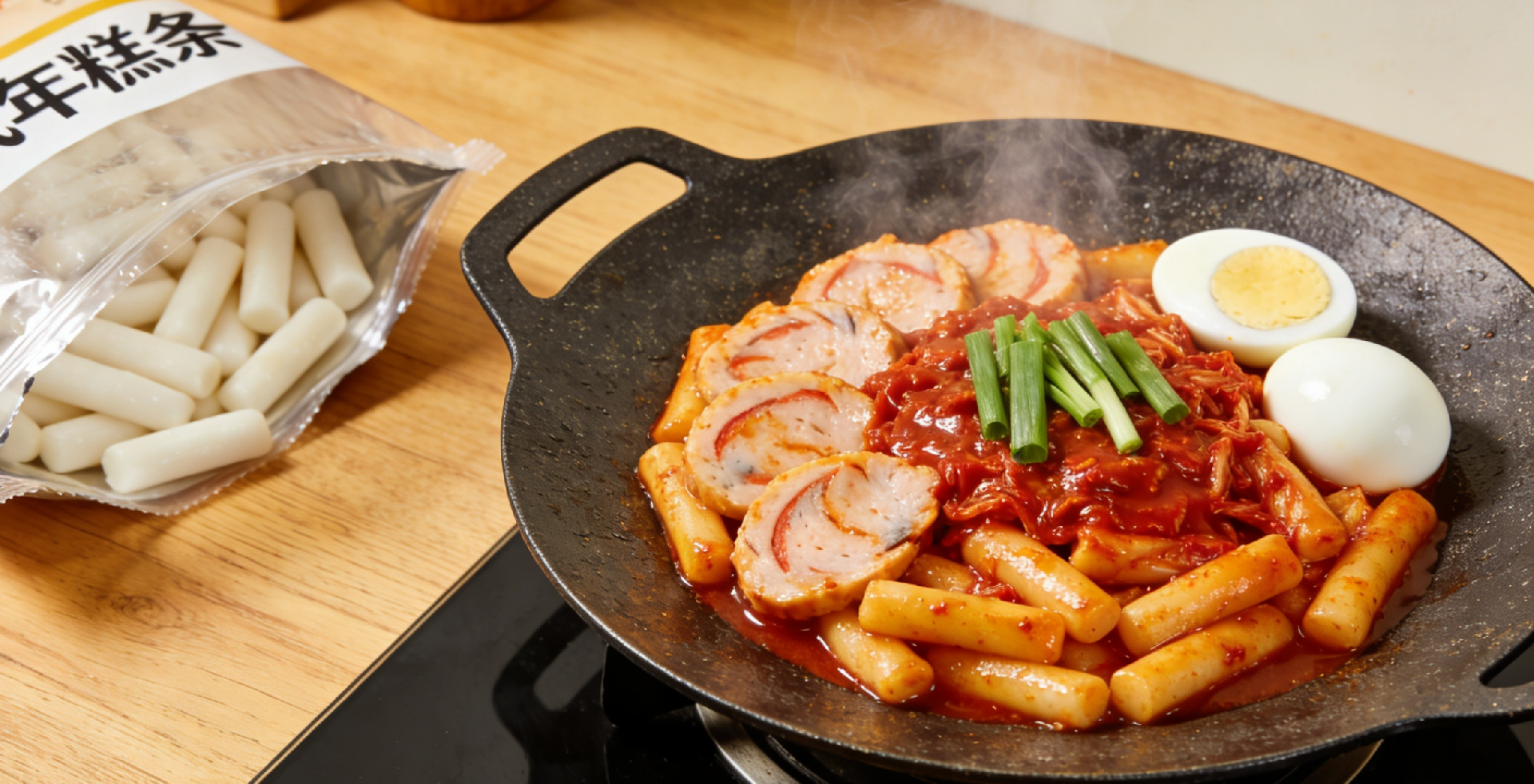 由大米制成,自然白亮,口感细腻软糯,搭配不同酱汁可制作多种风味的炒年糕:经典炒年糕、芝士炒年糕等。